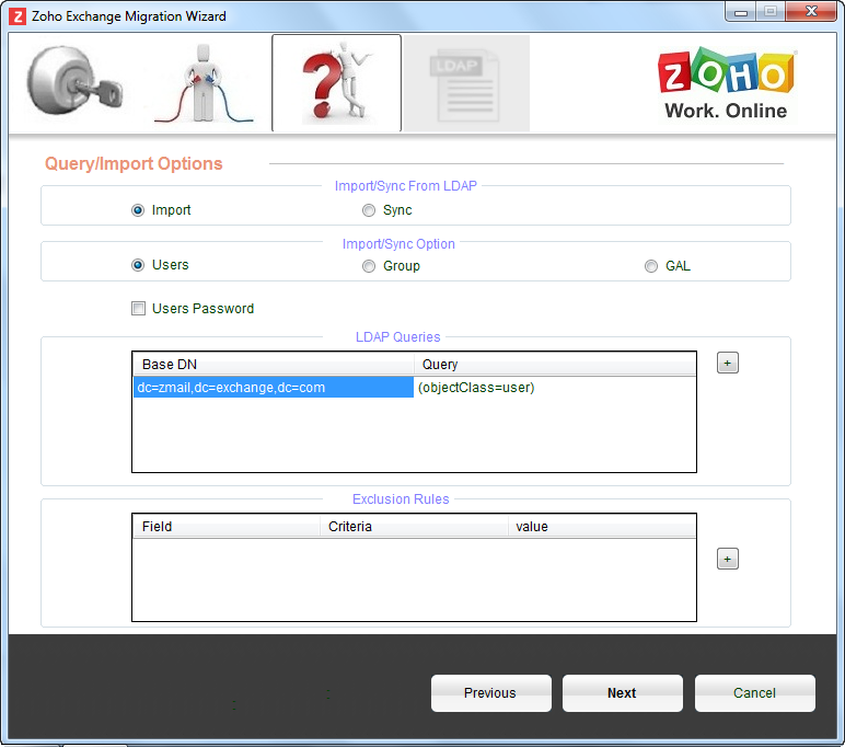 - You can choose whether you want to import the users or Groups or the GAL (Global Address List) from the LDAP server. When you choose Import the existing users in Zoho Mail organization are skipped and new users from the LDAP will be imported in Zoho Mail.