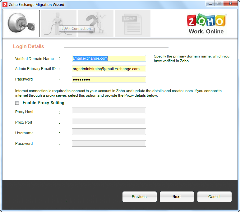 - Provide the Zoho super admin or admin account credentials, and the details of the domain you have added and verified in Zoho. In case you connect to the internet via Proxy server, provide the proxy server details, as active connection is required for migration.