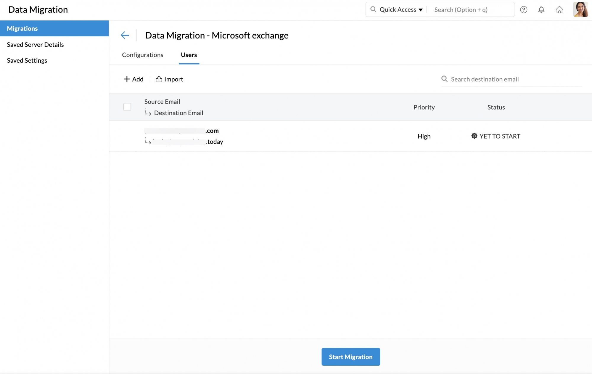 Once you have added the user accounts for the migration, you can start the migration. Ensure that the source passwords are not changed after adding the users for migration. The password should be the same until the entire migration process is completed.