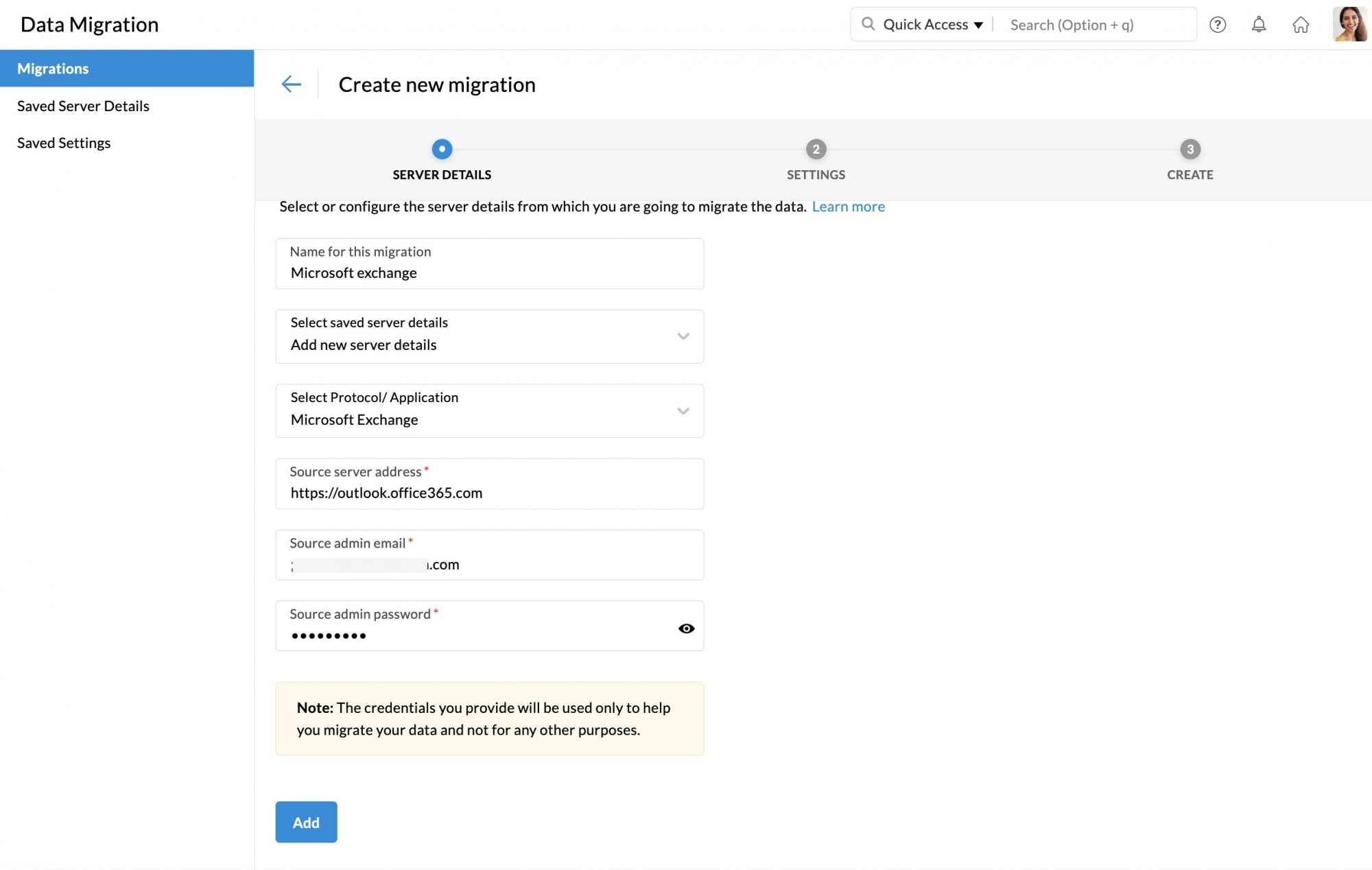 The server details you added will be saved in the Saved Server Details page, and you can use it for performing other migrations just by picking it from the dropdown.