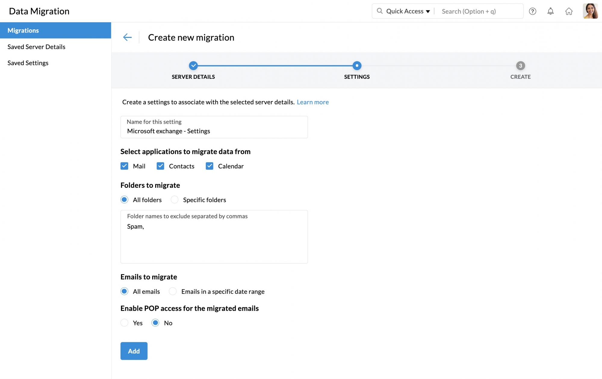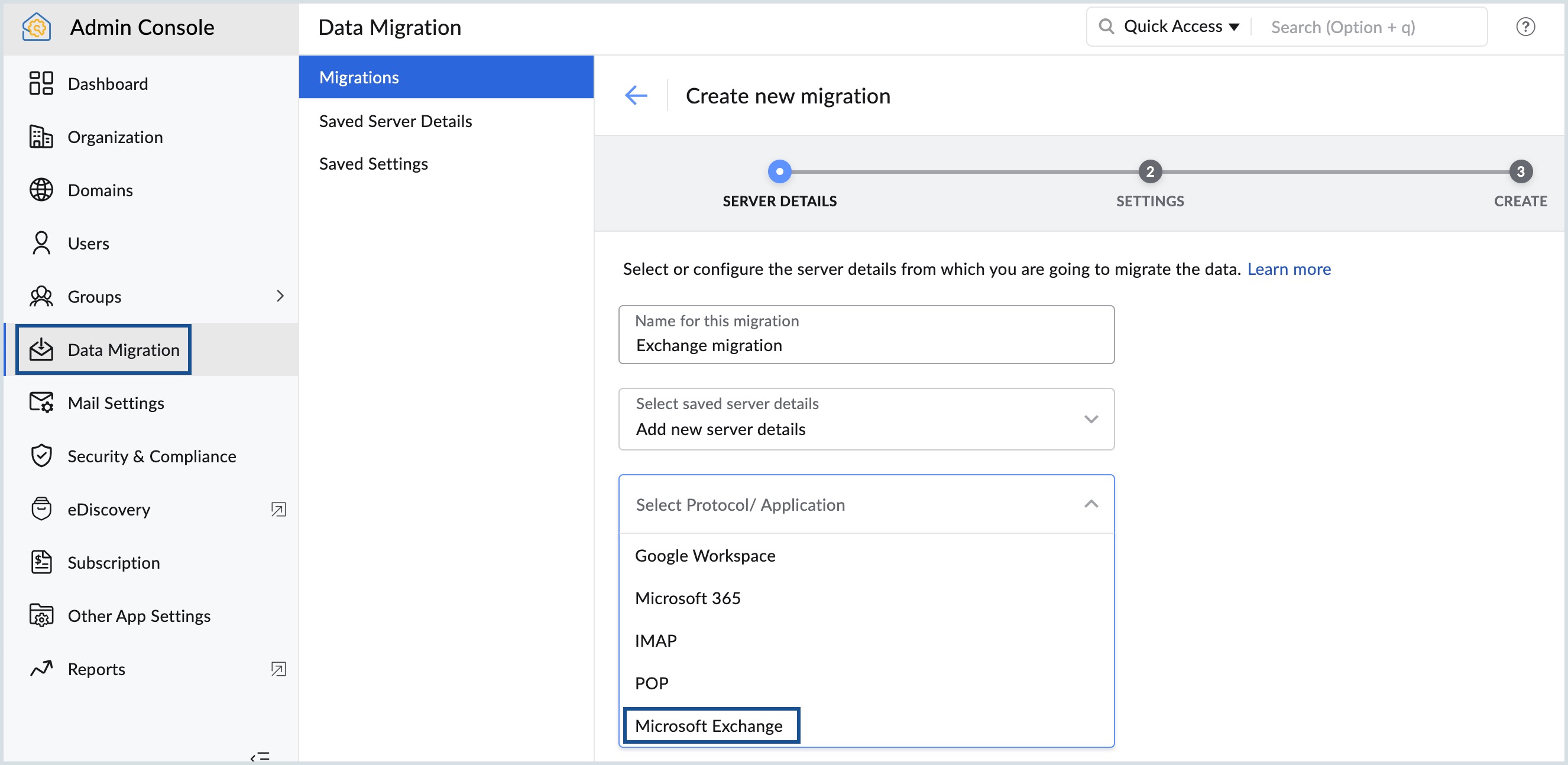 The Microsoft Exchange Server is an email and calendaring server developed by Microsoft. You can migrate Email, Contacts and Calendar data from the Exchange Server to Zoho Mail. The respective user accounts need to be created in Zoho Mail before adding the migration. Follow this link for detailed instructions on user addition.