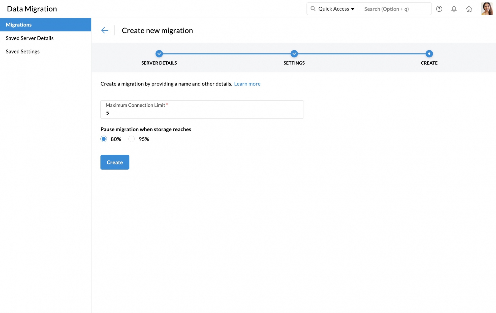 - Select whether you would like to pause migration when the storage reaches 80% or 95%, and finally click Create.