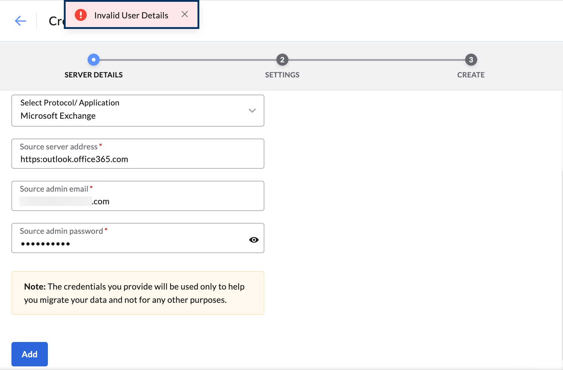 - Provide the user's source email address in the Microsoft Exchange username field.