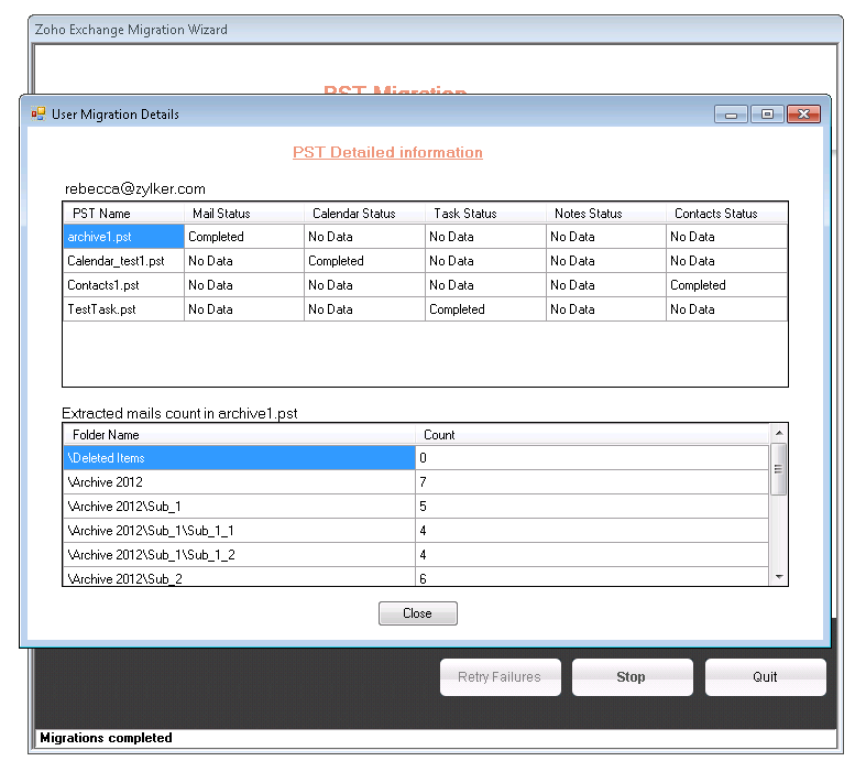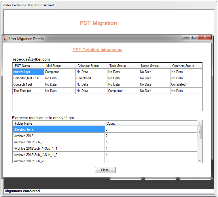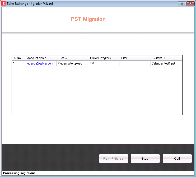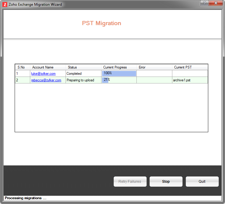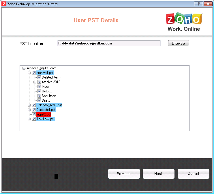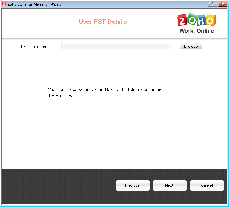 The administrators can migrate emails for multiple users from the Outlook PST files, to Zoho Mail, using the Outlook PST Migration option in the Zoho Migration Wizard.