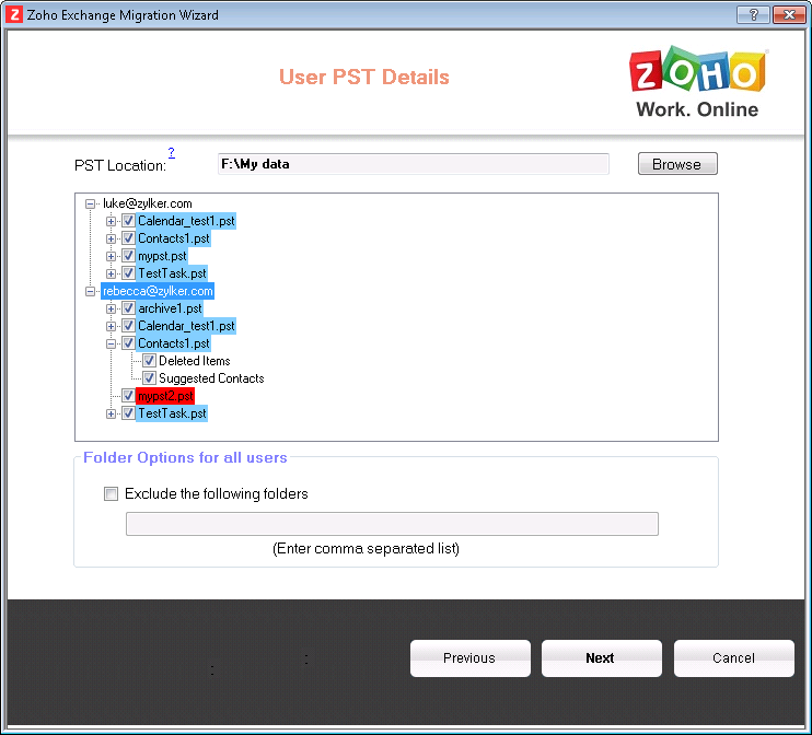 The Administrator can migrate different PST files into the accounts of different users. The destination email accounts need to be created in Zoho under the same organization before the Migration process. When you have to migrate multiple PST files for multiple users, follow the preparatory steps specified below before migration.