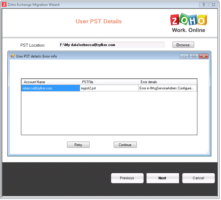 - If the password protected PST files have encountered an error, try removing the passwords and click 'Retry' to go back to Step 10.