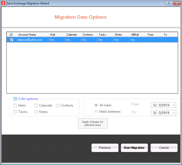 - If you want to migrate mails that fall in a specific period, select 'Mails Between' and enter the 'From' and 'To' dates. Click on 'Apply Changes for Selected Users'.
