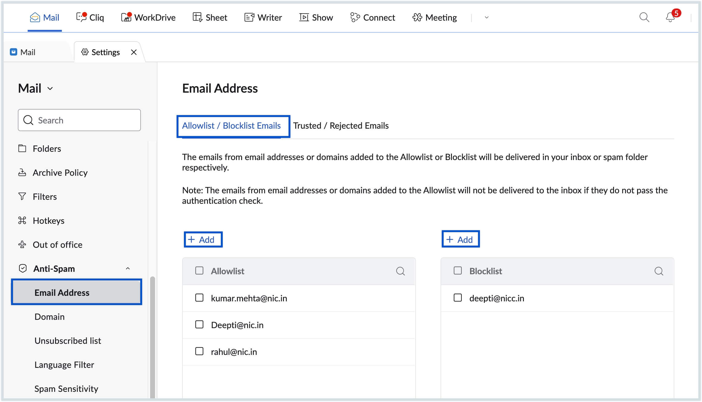 As mentioned previously, the email addresses added to the Allowlist/Blocklist are subject to certain spam checks. To avoid legitimate emails getting delivered in the spam folder, you can add such email addresses to the trusted list or rejected list. The emails from addresses added to the trusted list are sent to the inbox without any spam checks. And the emails from addresses added to the rejected list are bounced without any checks.