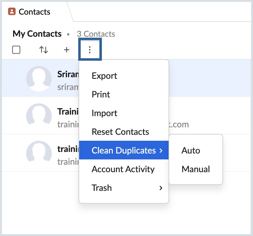 When you add or import contacts, having duplicate contacts becomes inevitable. The clean duplicates option helps you to detect and clean the duplicate contacts in your account.